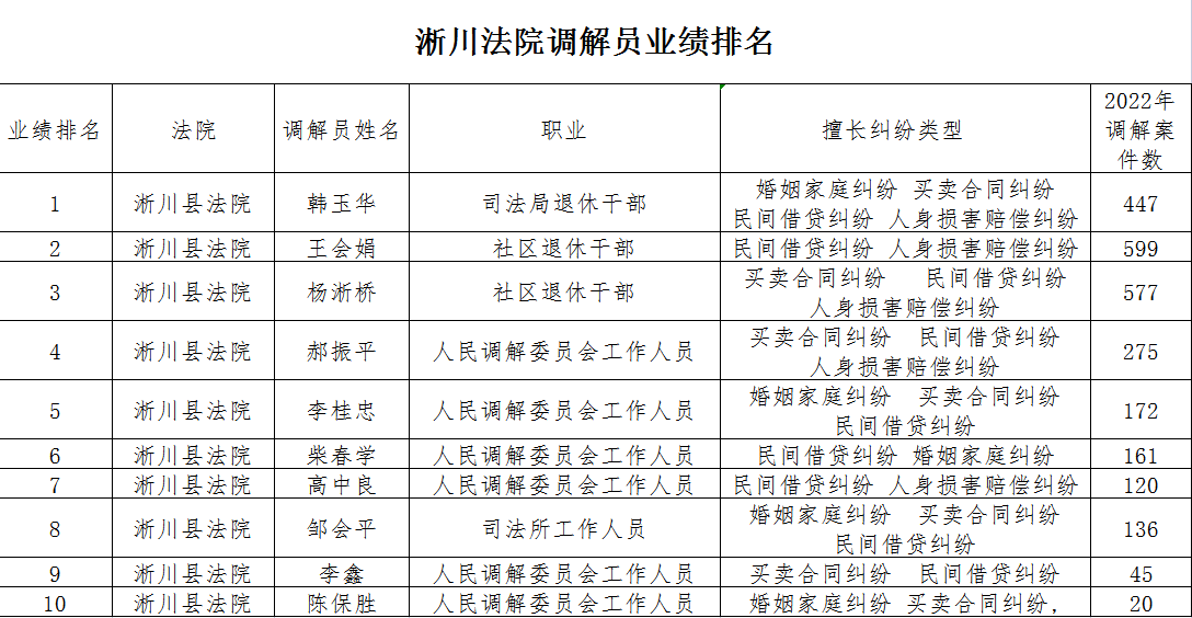 淅川法院调解员业绩排名